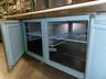 We currently have many refrigerated prep tables in stock right now. Some are small and some are quite large, like this unit from Delfield. It measures 93" wide (left to right) and about 32" deep (front to back). It has 3-doors , heavy duty shelving inside the refrigerator, and many stainless steel containers underneath the two metal doors. Like all of our non-new products, this cooler has been cleaned and refurbished and is ready to go. The pictures below tell the whole story.